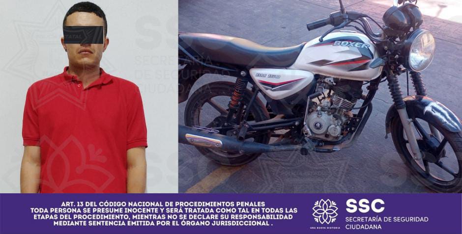 Primeramente, elementos del Grupo de Combate al Robo de Vehículos y Transporte adscrito a la Dirección de Investigación de la SSC aseguraron a Carlos Alberto N., de 38 años, cuando manejaba una motocicleta marca Honda, color blanca de manera negligente en la entrada al municipio de Totolac.
