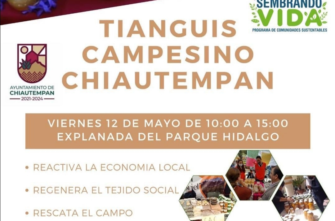 El Ayuntamiento de Chiautempan en coordinación con el programa de Comunidades Sustentables de Sembrando Vida, invita a la población al «Tianguis Campesino» que se desarrollará el próximo viernes 12 de mayo en la explanada del Parque Hidalgo, en un horario de 10:00 a 15:00 horas.