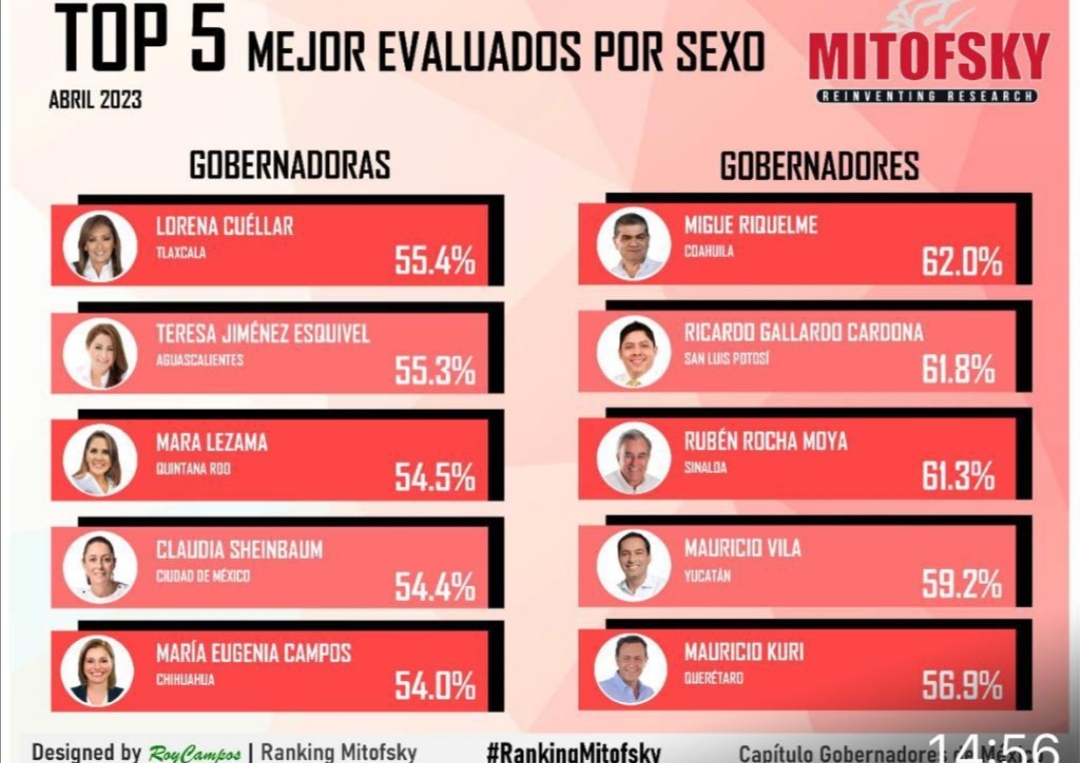 Cuéllar Cisneros superó a sus similares de Aguascalientes Teresa Jiménez Esquivel quien obtuvo 55.3 por ciento; de Quintana Roo Mara Lezama con 54.5 por ciento, incluso por arriba de la posible candidata a la presidencia de México, Claudia Sheinbaum que registró 54.4 por ciento y de Chihuahua María Eugenia Campos con 54 por ciento.