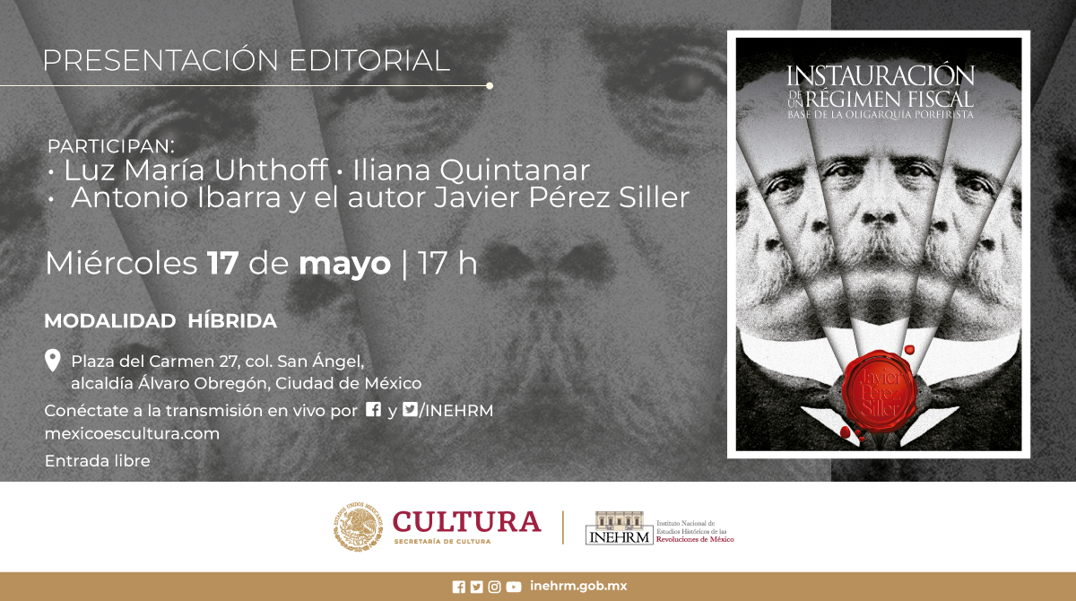 Para contribuir a la divulgación de investigaciones que aporten originales enfoques al conocimiento de la historia del porfiriato, la Secretaría de Cultura federal, a través del Instituto Nacional de Estudios Históricos de las Revoluciones de México (Inehrm), presentará la novedad editorial: Instauración de un régimen fiscal: base de la oligarquía porfirista, del historiador Javier Pérez Siller, el miércoles 17 de mayo de 2023.