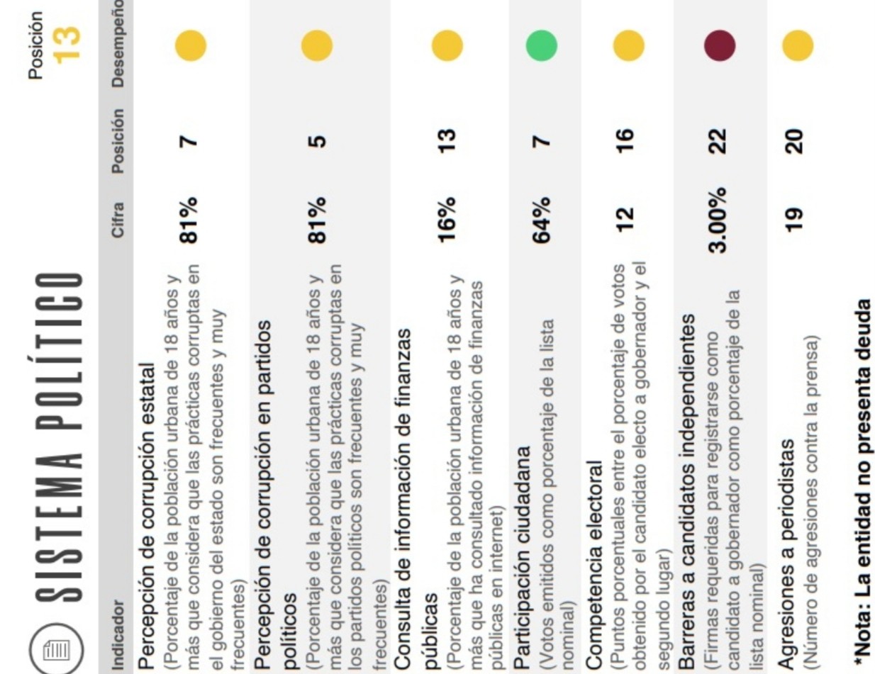 Lo anterior representa una mejora en los indicadores de percepción de corrupción, participación ciudadana, consulta de información y rendición de cuentas, pues ese subíndice mide el potencial de los sistemas políticos estatales para ser estables y funcionales.