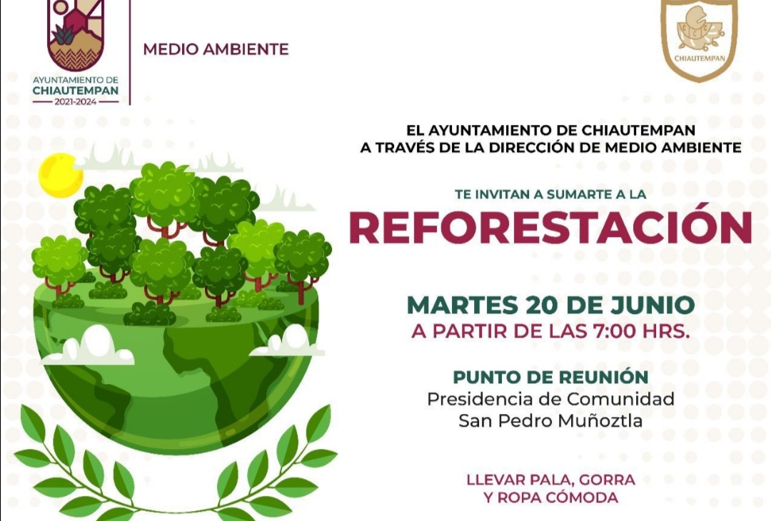 El Ayuntamiento de Chiautempan a través de la Dirección de Medio Ambiente, invita a la población en general a participar en la jornada de reforestación, agendada para este martes 20 de junio.