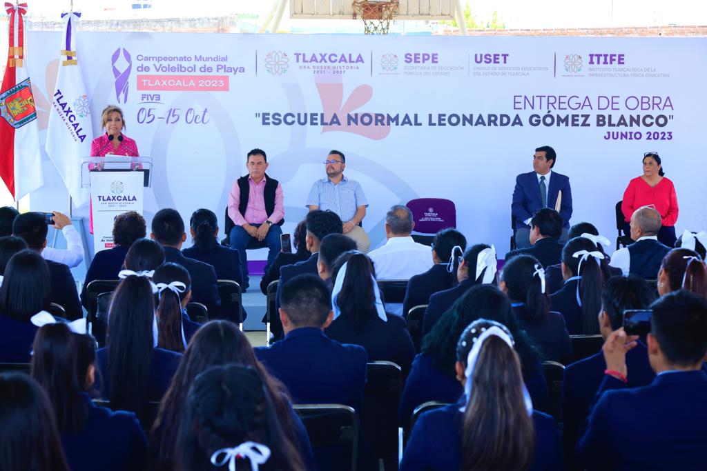 La gobernadora Lorena Cuéllar Cisneros visitó el municipio de Santa Apolonia Teacalco para entregar obras de rehabilitación en la Normal Primaria “Profra. Leonarda Gómez Blanco”, lo que beneficiará directamente a 307 estudiantes y al personal que labora en la institución.