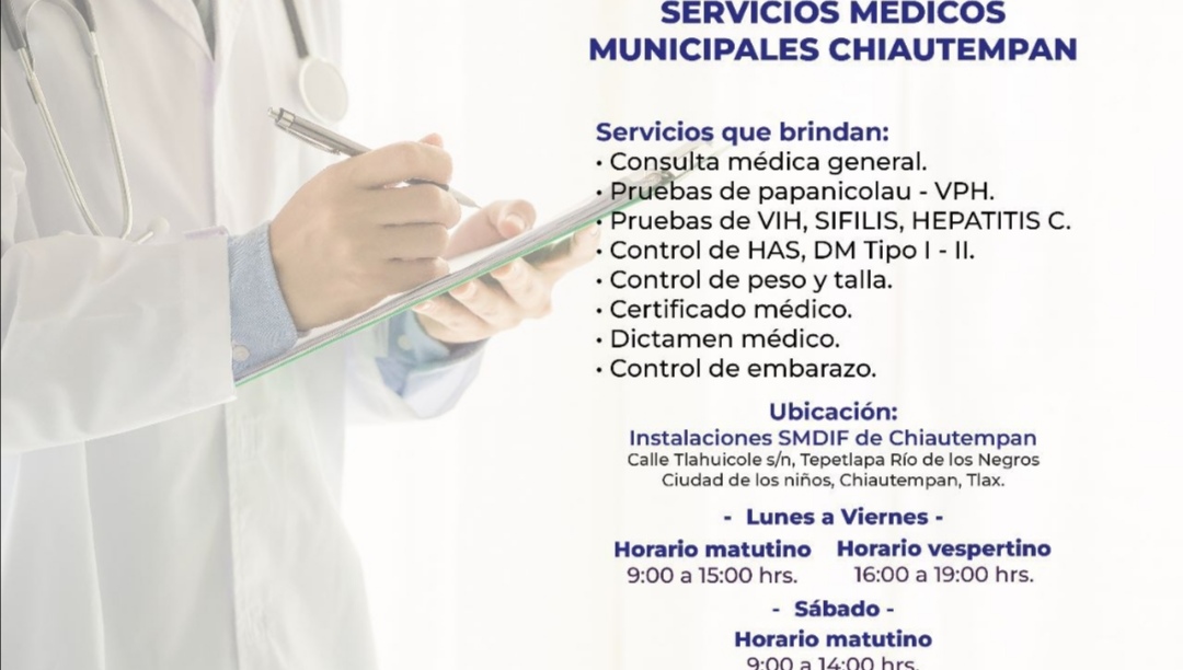 Entre los servicios que ofrece el SMDIF, se encuentra la consulta médica general, pruebas de Papanicolau – VPH, VIH, Sífilis, Hepatitis, Control de HAS, DM Tipo I – II, peso y talla, certificado y dictamen médico, además de control de embarazo.