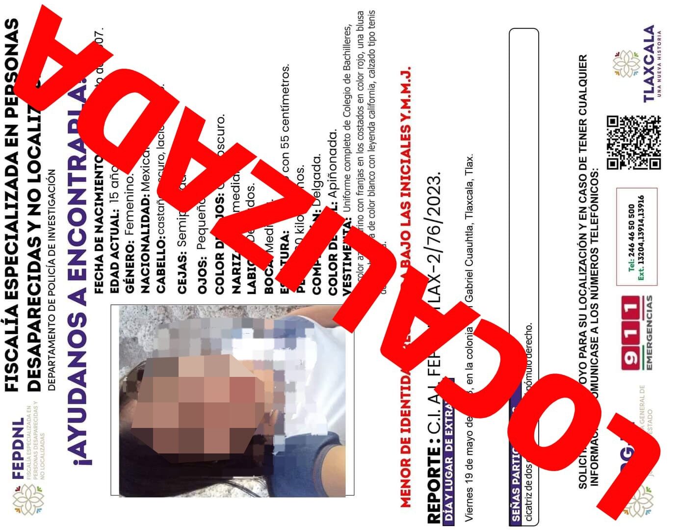 La Policía de Investigación adscrita a la Fiscalía Especializada en Personas Desaparecidas y No Localizadas (Fepdnl) de la Procuraduría General de Justicia del Estado (PGJE) ubicó a una menor de edad reportada por sus familiares como desaparecida.