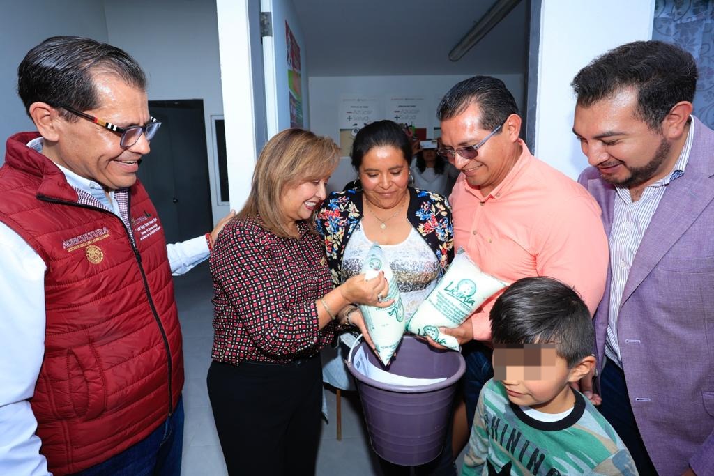 La titular del Ejecutivo local, Lorena Cuéllar Cisneros, acompañada del gerente nacional de abasto de Liconsa del Gobierno de México, Víctor Hugo Pérez Rojas, puso en marcha la lechería Liconsa en el municipio de Huamantla y entregó 167 tarjetas a beneficiarios del programa de abasto social.
