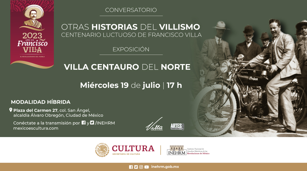 En el marco de la conmemoración nacional del centenario luctuoso de Francisco Villa, la Secretaría de Cultura del Gobierno de México, a través del Instituto Nacional de Estudios Históricos de las Revoluciones de México (Inehrm), invita a la charla “Otras historias del villismo: Centenario luctuoso de Francisco Villa”, el miércoles 19 de julio de 2023.