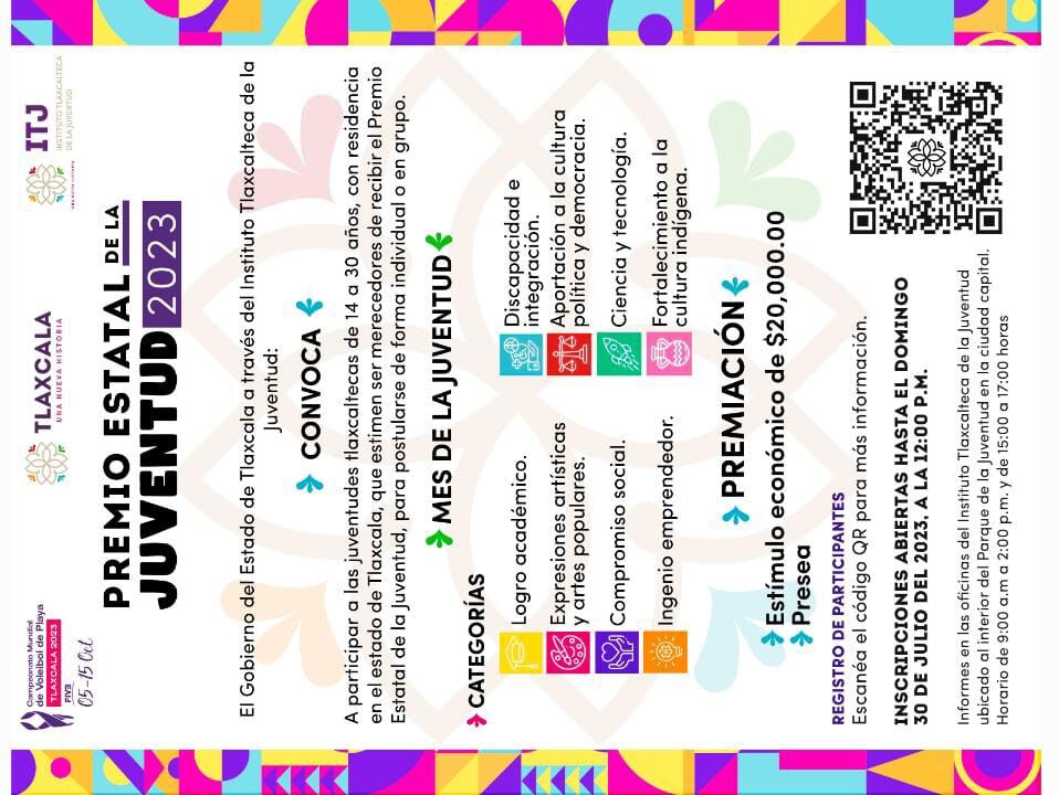 El gobierno del estado, a través de Instituto Tlaxcalteca de la Juventud (ITJ), convoca al Premio Estatal de la Juventud 2023, dirigido a mujeres y hombres de entre 14 y 30 años de edad, con el objetivo de distinguir a quienes por su conducta o dedicación al estudio han destacado a favor de su desarrollo y de este sector de Tlaxcala.