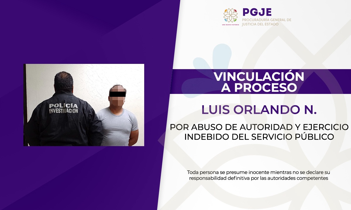 El agente del Ministerio Público del fuero común adscrito a la Fiscalía Especializada en Combate a la Corrupción (FECC) de la Procuraduría General de Justicia del Estado (PGJE) obtuvo la vinculación a proceso en contra de Luis Orlando N., elemento policiaco inactivo de la dirección de Seguridad Pública municipal de Yauhquemehcan, por los delitos de abuso de autoridad y ejercicio indebido del servicio público.