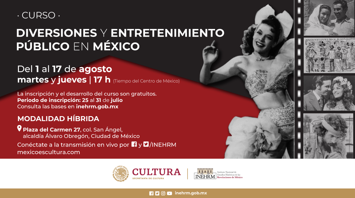 En la atmósfera de verano, del derecho humano al disfrute del descanso, el ocio y el esparcimiento, la Secretaría de Cultura del Gobierno de México, a través Instituto Nacional de Estudios Históricos de las Revoluciones de México (Inehrm), invita al curso en formato híbrido: “Diversiones y entretenimiento público en México”, que tendrá lugar durante el mes de agosto de 2023, y cuyo periodo de inscripción está vigente 25 al 31 de julio, en: https://inehrm.gob.mx/es/inehrm/Curso_Diversiones_y_entretenimiento_publico_en_Mexico