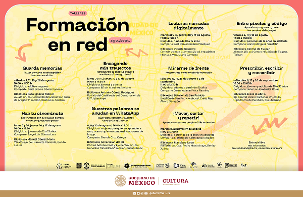 El taller “Ensayando mis trayectos” que se realizará los lunes 7 y 14, jueves 10 y 17 de agosto en un horario de 16:00 a 17:30 horas, dirigido a jóvenes y adultos, será impartido en la Biblioteca Pública “Antonio Gómez Rodríguez”, ubicada en la alcaldía Iztapalapa. Los días 8, 9 y 10 de agosto, en un horario de 16:00 a 18:00 horas, se impartirá el taller “Nuestras palabras se anudan en WhatsApp”, está dirigido a mujeres que quieren aprender a usar, usan o buscan compartir otros usos de de la plataforma de mensajería, este taller tendrá como sede la Biblioteca Pública “Generación del 68”, en la alcaldía Cuauhtémoc.