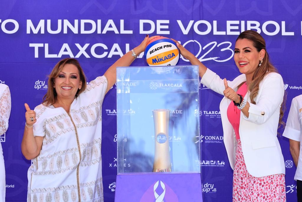 Como parte de las actividades de promoción del Mundial de Voleibol de Playa Tlaxcala 2023, la gobernadora del estado, Lorena Cuéllar Cisneros y su homóloga de Guerrero, Evelyn Salgado Pineda, develaron el trofeo que será entregado a los finalistas de la competencia internacional, a realizarse del 5 al 15 de octubre.