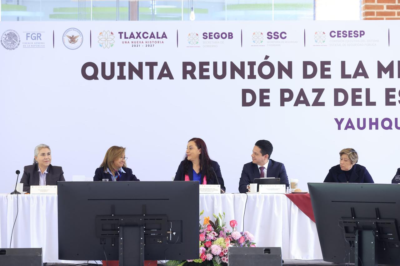 La gobernadora Lorena Cuéllar Cisneros encabezó este viernes la quinta reunión de la Mesa Interregional de Paz en Tlaxcala, en la que participó Martha Beatriz López López, representante de la Secretaría de Seguridad y Protección Ciudadana federal (SSPC), integrantes del gabinete de seguridad estatal y los 60 presidentes municipales.