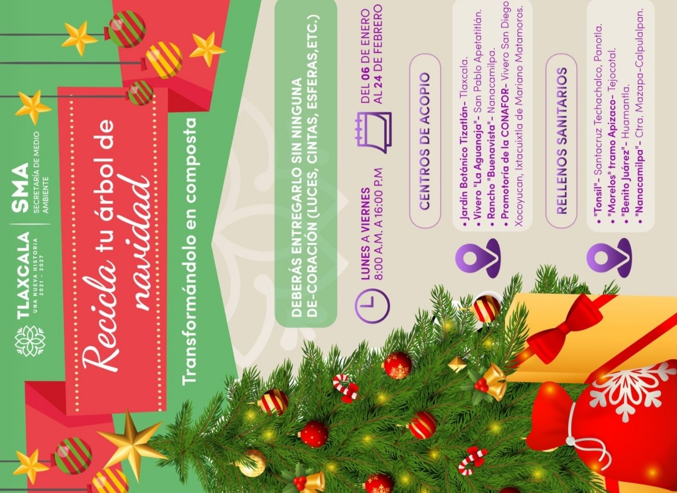 La Secretaría de Medio Ambiente del Estado (SMA) realizará la campaña “Recicla tu Árbol de Navidad” del 6 de enero al 24 de febrero 2025, con el objetivo de fomentar el reciclaje de los recursos naturales y la cultura ambiental por medio de la separación y reutilización de estos ejemplares en compostaje para la propagación de otras especies.