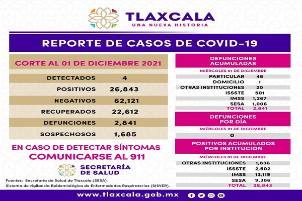 Los datos de la SESA registrados en la plataforma nacional del Sistema de Vigilancia Epidemiológica de Enfermedades Respiratorias (Sisver), confirmaron 4 casos positivos de Covid-19 y cero defunciones el 01 de diciembre de 2021.