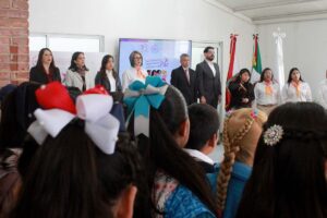 Asimismo, las presidentas honoríficas del Sistema Estatal para el Desarrollo Integral de la Familia (Sedif) y del Comité Consultivo de Bienestar y Desarrollo Social del estado, Mariana y Fernanda Espinosa de los Monteros Cuéllar, respectivamente, integrantes del gabinete legal y ampliado, docentes y padres de familia, entre otros.