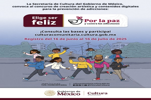 La Secretaría de Cultura del Gobierno de México, a través de la Dirección General de Vinculación Cultural, convoca al concurso nacional de creación artística y contenidos digitales “Elige ser feliz. Por la paz y contra las adicciones”.