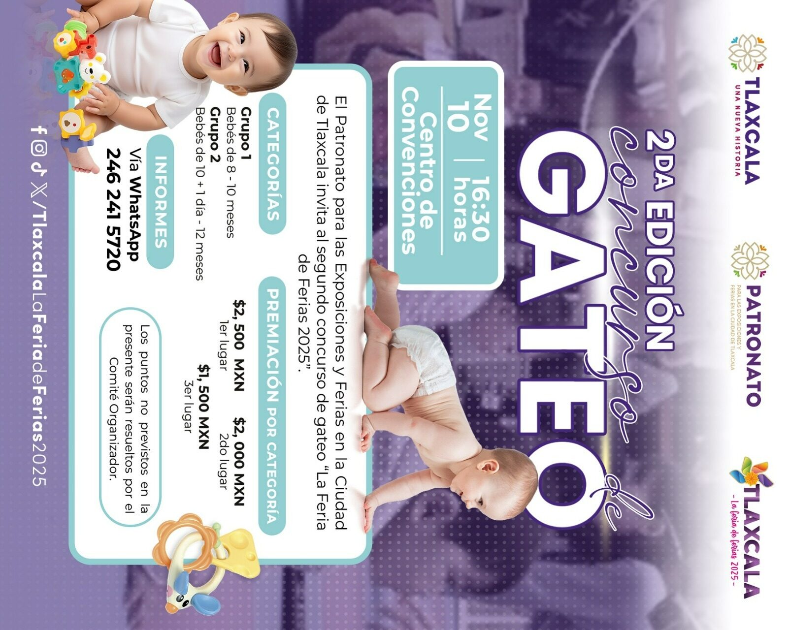 El concurso de gateo se realizará el 10 de noviembre a las 16:30 horas en el Centro de Convenciones, e incluye las categorías de bebés de 8 a 10 meses, y bebés de 10 meses y un día a 12 meses. Los tres primeros lugares recibirán premios en efectivo de 2 mil 500, 2 mil y mil 500 pesos, respectivamente.