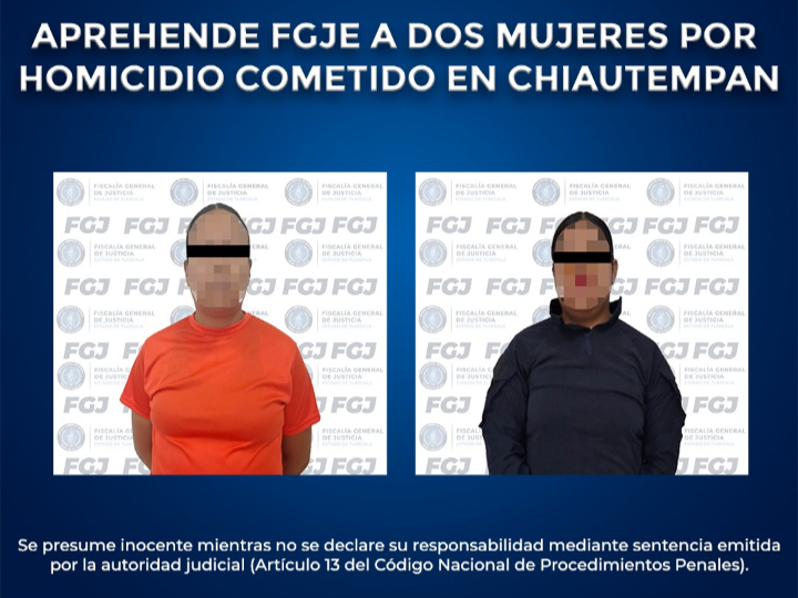 Las investigaciones de inteligencia realizadas por la Policía de Investigación de la Fiscalía General de Justicia del Estado (FGJE) permitieron la detención de Lizbeth N. y Lesly N., por el delito de homicidio calificado, ocurrido en el municipio de Chiautempan.