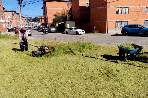 La brigada de Servicios Públicos llegó a la Unidad Santa Cruz, donde realizó trabajos de limpieza y mantenimiento de áreas verdes, en atención a una instrucción de la alcaldesa Blanca Angulo para mejorar la imagen urbana.