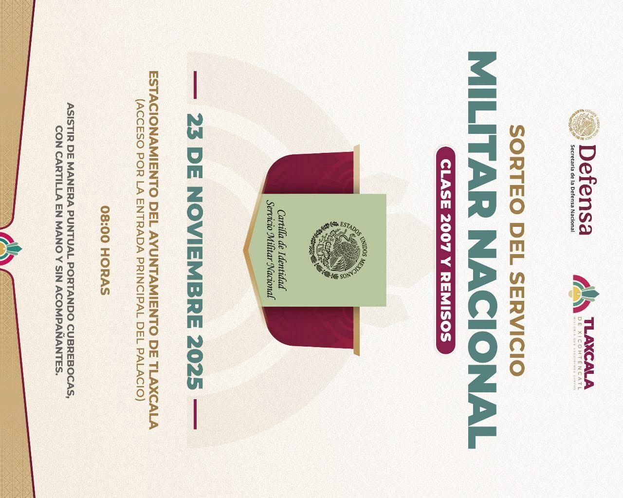 El Ayuntamiento de Tlaxcala informa a las y los jóvenes de la clase 2007 y remisos que realizaron su registro en la Junta Municipal de Reclutamiento, que el sorteo del Servicio Militar Nacional se llevará a cabo el domingo 23 de noviembre de 2025, a las 8:00 horas, en el estacionamiento número 1 de la Presidencia Municipal, con acceso por la entrada principal.