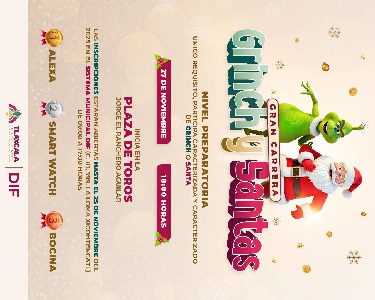 En el marco de los festejos navideños de este año, el Ayuntamiento de Tlaxcala, que preside Alfonso Sánchez García, a través del Sistema Municipal DIF, invita a la ciudadanía a la carrera “Grinch y Santas”, que se llevará a cabo este jueves 27 de noviembre a las 18:00 horas, el cual tendrá como punto de partida la Plaza de Toros Jorge Aguilar “El Ranchero” y culminará frente a la sede del Palacio Municipal.