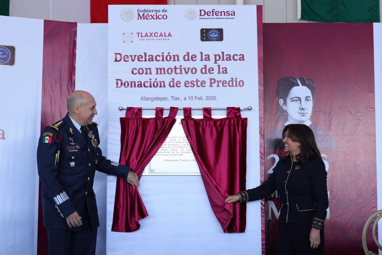 La gobernadora Lorena Cuéllar Cisneros entregó las escrituras del predio “Rancho San Antonio Zacapexco”, ubicado en el municipio de Atlangatepec, en donación a la Secretaría de la Defensa Nacional (Sedena), para la ampliación de la Estación Aérea Militar Número 9. Acompañada de autoridades militares, develó una placa conmemorativa por este acontecimiento.