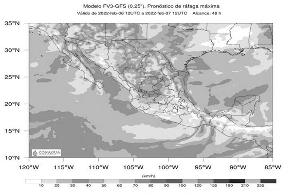 La masa de aire frío que impulsa al sistema, además de una vaguada polar sobre el noroeste del territorio nacional, en interacción con el ingreso de humedad generada por la corriente en chorro subtropical, por la tarde se pronostica, cielo medio nublado y viento de dirección variable de 10 a 20 km/h con rachas de 35 km/h.