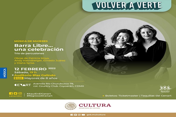 El ciclo inicia a las 19:00 horas, con el concierto “Una celebración”, a cargo del trío de percusiones Barra Libre, integrado por Kaoru Miyasaka, Maribel Pedraza y Gabriela Orta que interpretarán obras su primer material discográfico “Triciclo”, que contiene piezas escritas por compositoras mexicanas. Para más información consulta la página www.cenart.gob.mx