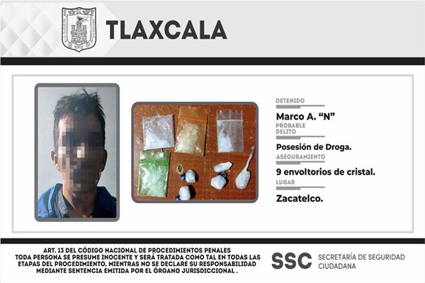La Secretaría de Seguridad Ciudadana (SSC) detuvo a una persona en el municipio de Zacatelco, por su probable responsabilidad en delitos contra la salud en su modalidad de narcomenudeo; esto como resultado de los operativos y acciones permanentes implementadas para la disminución, prevención y combate de la incidencia delictiva en la entidad.