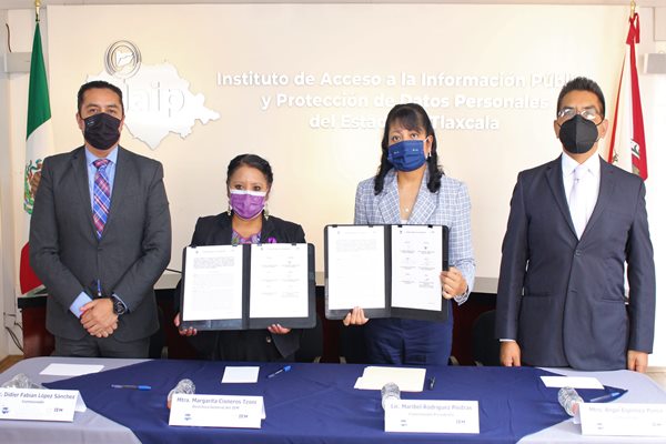 En la firma de convenio de colaboración estuvieron presentes los comisionados del órgano garante Ángel Espinoza Ponce y Didier Fabian López Sánchez, así como personal operativo del Instituto Estatal de la Mujer, Nery Hernández Córdoba, Jefa de Departamento y Guadalupe Pérez Hernández, Jefa de Oficina Jurídica de dicho Instituto.